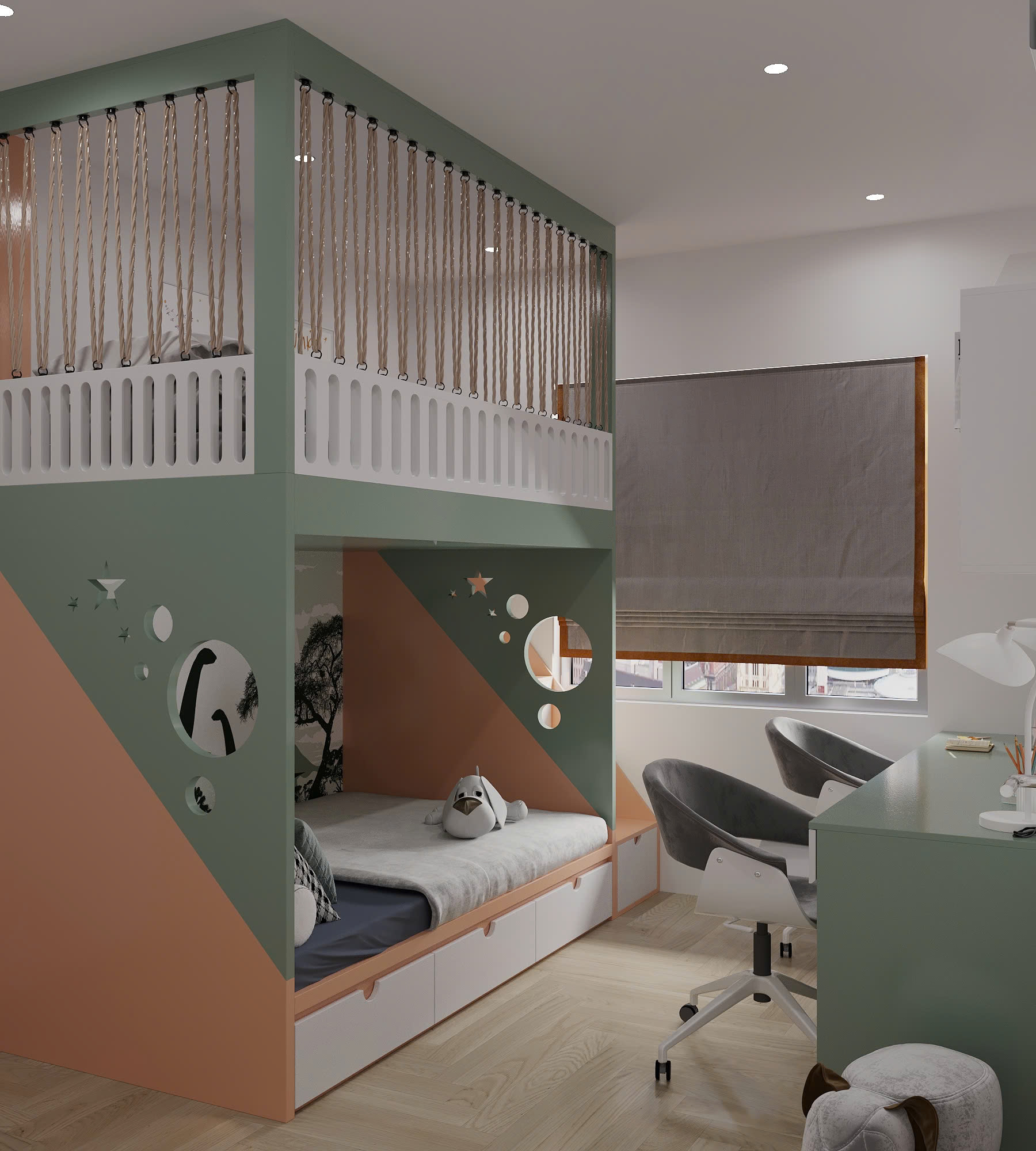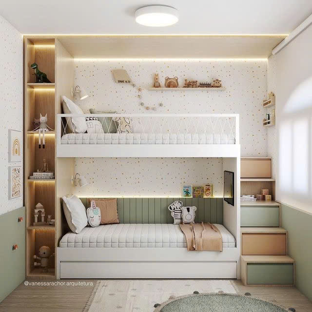 Lựa chọn giường tầng thông minh để chia thành 2 khu vực học tập và nghỉ ngơi dành cho bé. Với phía trên là là giường để ngủ được thiết kế lưới bảo vệ tạo cảm giác an toàn cho bé, còn phía dưới sẽ là khi vực vui chơi học tập được bố trí những học kệ sách và tủ quần áo giúp bé lưu trữ những món đồ ca nhân.
