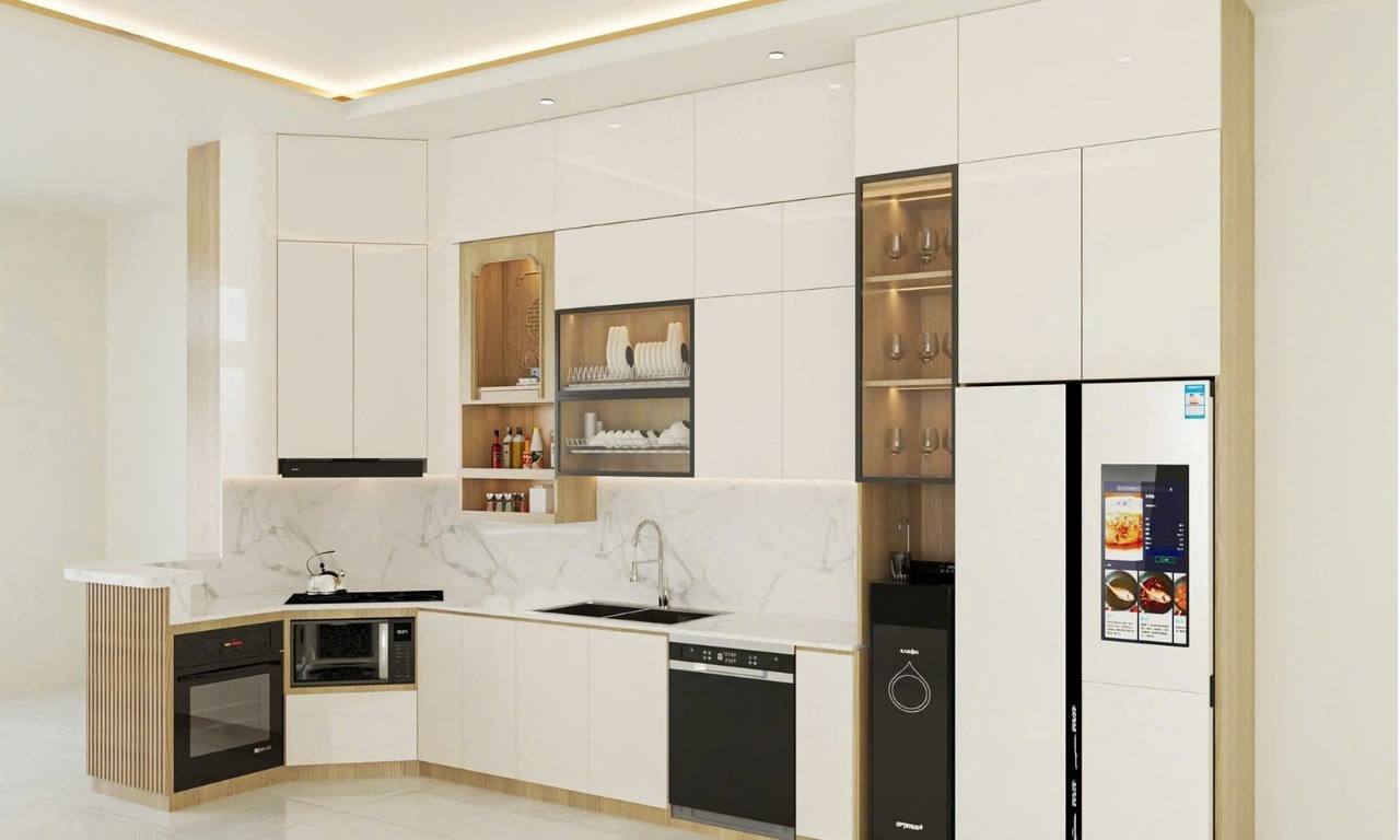 Hệ tủ bếp chữ L nhỏ gọn, gỗ công nghiệp cao cấp