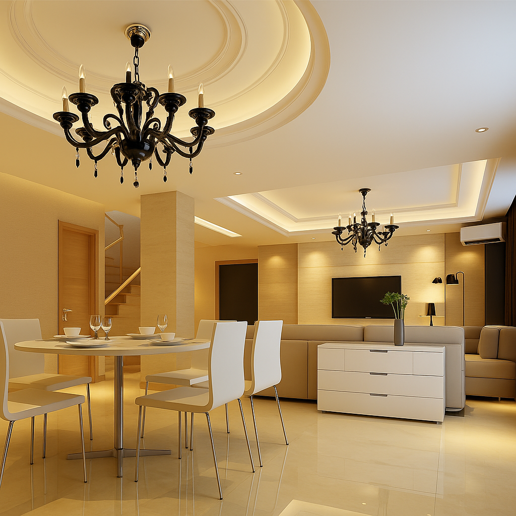 Kết hợp ánh sáng tự nhiên (giếng trời, cửa kính) với đèn nhân tạo.