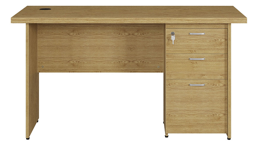 Bàn có dáng hình chữ nhật truyền thống, bề mặt phẳng, thuận tiện bố trí máy tính, hồ sơ và các vật dụng làm việc cần thiết. Cấu trúc liền khối với yếm và hộc liền giúp tổng thể bàn gọn gàng, đồng bộ và phù hợp nhiều không gian từ văn phòng công ty đến nội thất gia đình.