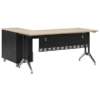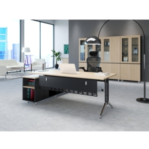 Sự kết hợp giữa màu vân gỗ tươi sáng và màu đen của khung thép mang lại cảm giác trẻ trung, thời thượng nhưng vẫn giữ được sự nghiêm túc cần thiết cho không gian làm việc của sếp.