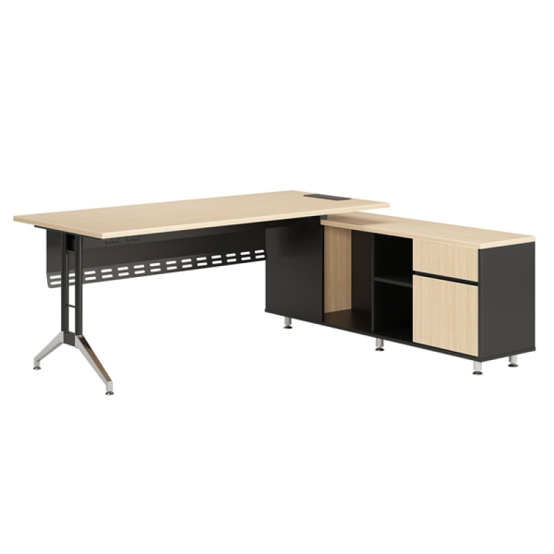 Bàn trưởng phòng LEP180C12 được thiết kế theo kiểu dáng chữ L, tích hợp tủ phụ cố định đi kèm, giúp tối ưu diện tích sử dụng và mở rộng không gian lưu trữ. Với kích thước tổng thể 1800 x 1600 x 750 mm, mẫu bàn này mang đến mặt bàn làm việc rộng rãi, phù hợp với những vị trí quản lý cần xử lý nhiều hồ sơ, thiết bị và tài liệu cùng lúc.