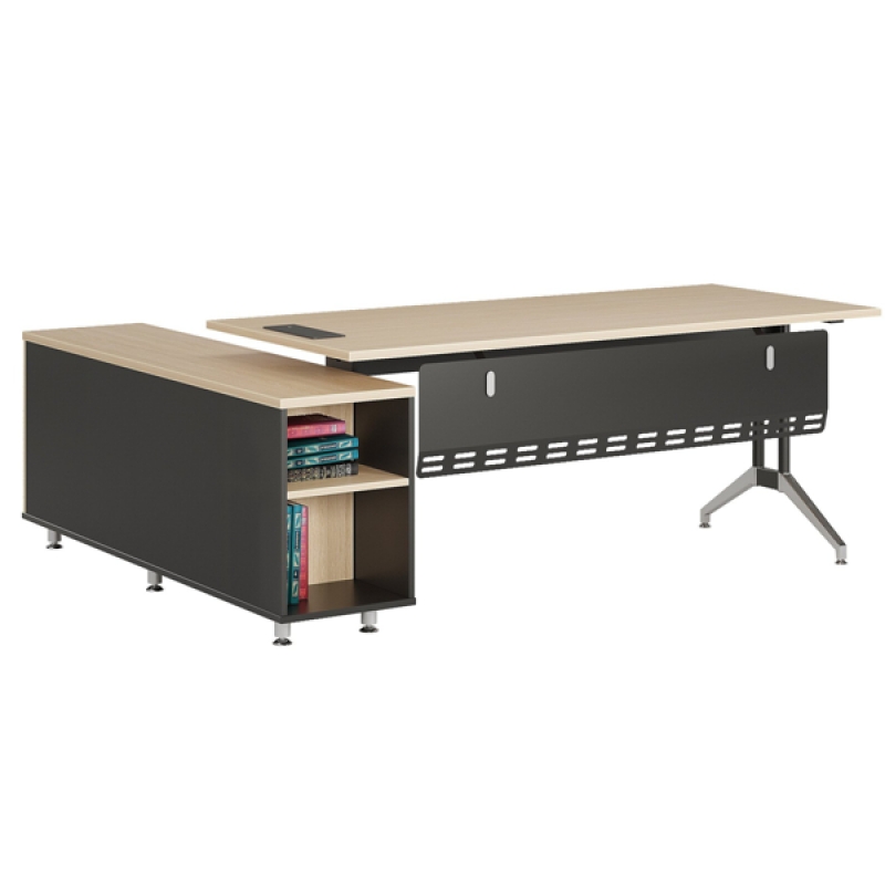 Sự kết hợp giữa màu vân gỗ tươi sáng và màu đen của khung thép mang lại cảm giác trẻ trung, thời thượng nhưng vẫn giữ được sự nghiêm túc cần thiết cho không gian làm việc của sếp.